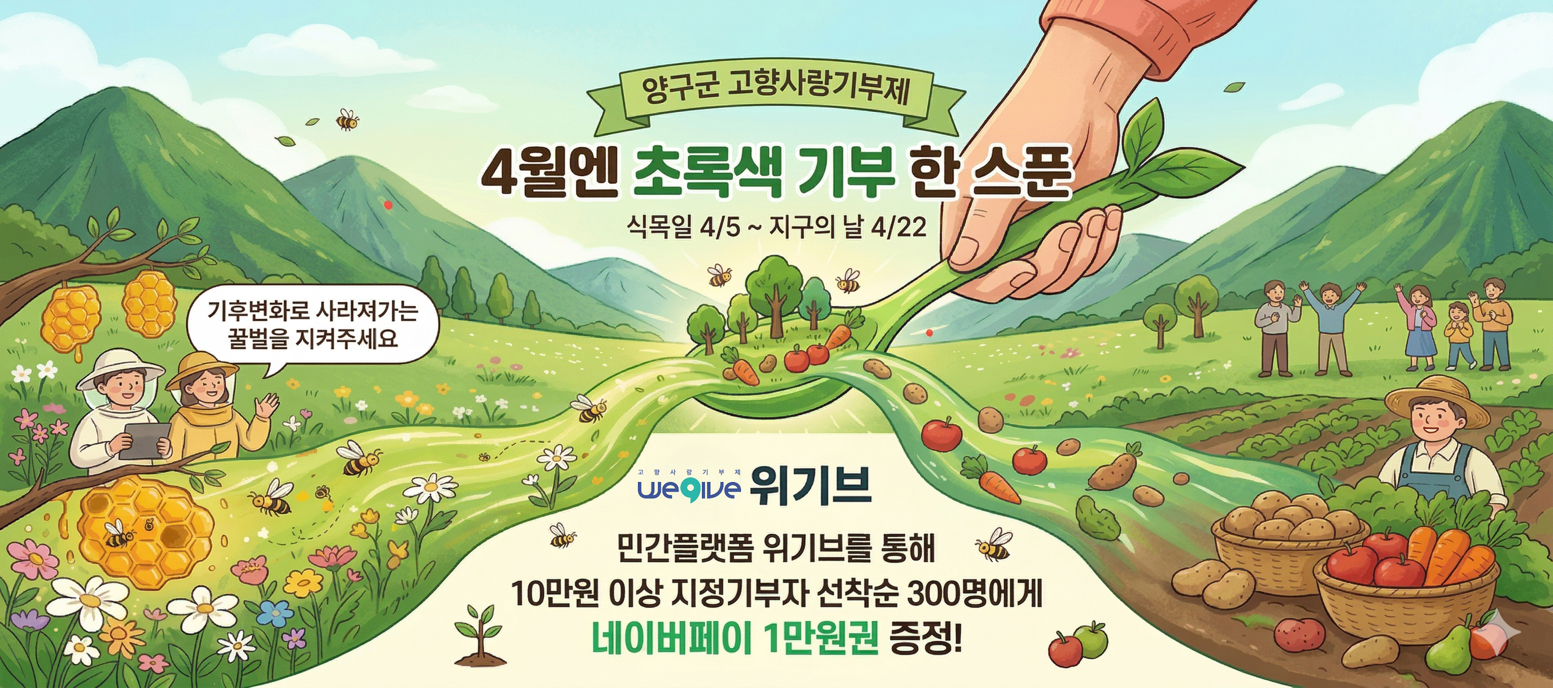 1️⃣ 양구군은 2026년 4월 5일부터 4월 22일까지 위기브에서 ‘4월엔 초록색 기부 한스푼’ 이벤트를 진행하며, 양구군에 10만 원 이상 기부한 사람 중 선착순 300명에게 네이버페이 1만 포인트를 제공합니다.