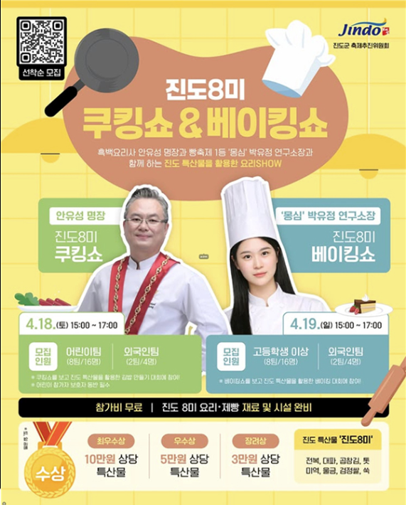 진도 8미 쿠킹쇼 & 베이킹쇼: 화제의 중심! '흑백요리사' 안유성 명장과 유명 빵집 '몽심'의 박유정 소장이 진도 특산물(전복, 대파, 톳, 울금 등)을 활용한 특별한 김밥과 빵을 선보입니다.