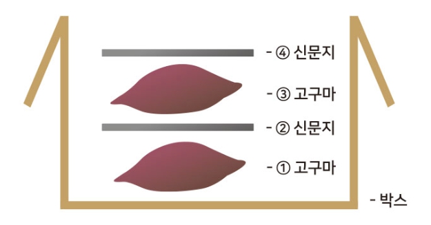 건조한 고구마는 박스에 담에 고구마-신문지-고구마-신문지 순으로 층을 만들어 보관해 주세요.